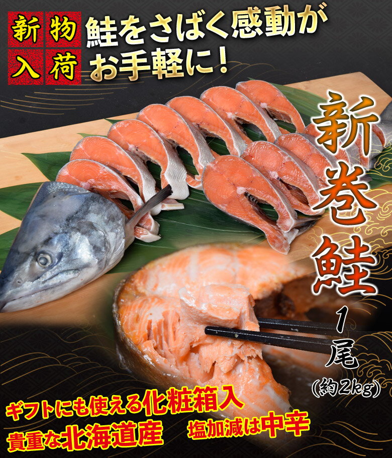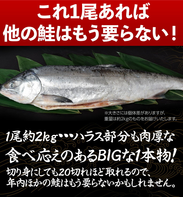 商品説明鮭の不漁で高騰が続く中、北海道産「新巻鮭」2キロのビッグな一本物がまさかの<<衝撃特価!!>>メス限定ですが、このサイズは肉厚で脂のりが違います。